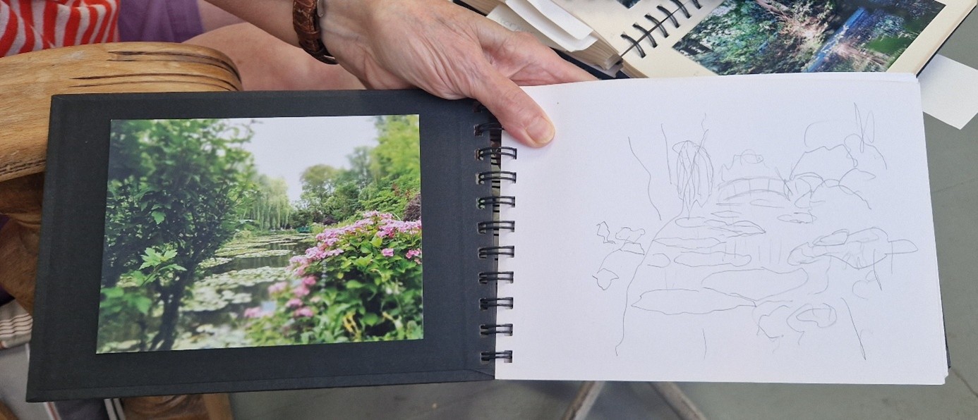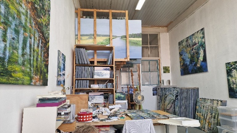 “Bij zonnig weer maak ik heel veel foto’s. Thuis bekijk ik ze en zoek ik dat stukje op dat ik mooi vindt om te schilderen. Ik dek delen van de foto af met papier tot ik een mooie uitsnede heb die ik wil gaan schilderen. Het kan ook zijn dat op die manier één foto de inspiratiebron is voor verschillende uitsneden en dus voor verschillende schilderijen. Heb ik mijn keuze voor het beeld bepaald, dan maak ik een ruwe schets om daarna een studie te maken met aquarel en of gouache, waar ik dan weer met oliepastel over heen ga, om het beeld op me in te laten werken. Dat zijn allemaal fases. Deze werkwijze is hier op het atelier in de loop der tijden ontstaan, nadat ik op de Vrije Academie veel meer met abstracte beelden werkte.”
