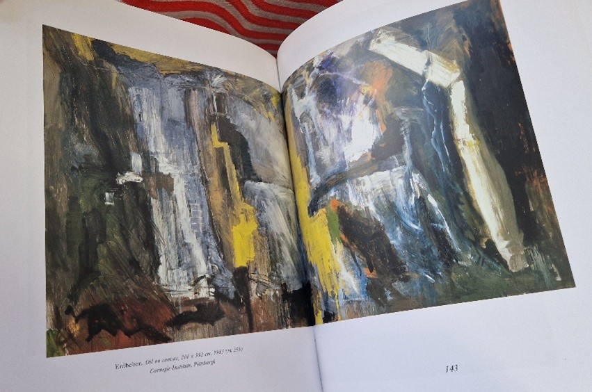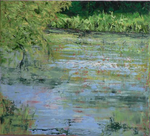 Bij binnenkomst in het atelier zag ik ook een soort verwantschap van Fenny’s werk met dat van Claude Monet (1840-1926), de grote Franse impressionist, en ik opper het voorzichtig: “Je bent niet de eerste die het zegt”, zegt Fenny. En als ik haar vraag of ze in Giverny in Frankrijk is geweest, waar Monet woonde en zijn inspiratie voor het parkachtige in zijn tuin daar vond: “Ja, ik ben er geweest en ik kan er niets mee, maar ik heb wel andere inspiratiebronnen.” Fenny pakt een aantal fotoboeken uit haar rijk gevulde boekenkast waar ze doorheen bladert: “Kijk hier, het werk van Nicolas de Stael, dat vind ik prachtig en ook dat van Gerhard Richter en de Deen Per Kirkeby.’Ik kan me deze inspiratiebronnen, kijkend naar haar werk, heel goed voorstellen: het zijn alle kleurrijke impressies elk op een eigen manier.