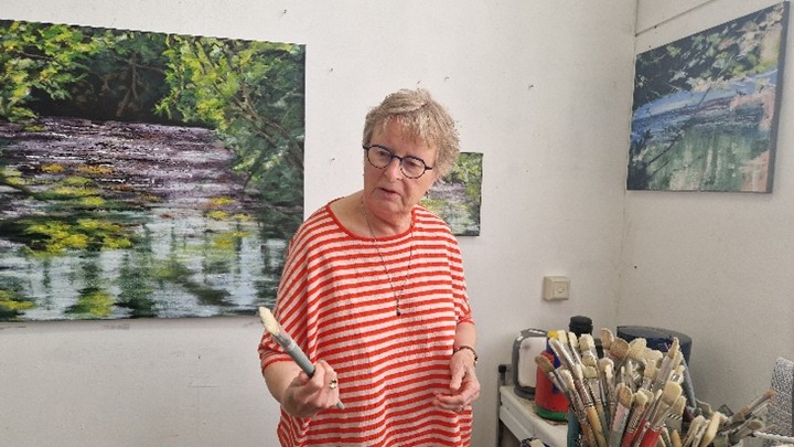 “Ik schilder een foto niet letterlijk na, ik zet de kleuren naar mijn hand. Mijn gevoel gaat er in en ik ontwikkelde een eigen techniek. Ik breng met de kwast pure verf op het doek in verschillende lagen en dan komt het bij mij aan op mengen. Voor het mengen gebruik ik alles wat voorhanden is, zoals de deksels van de ijsbakken uit de supermarkt. ‘Mengen, hè oma?’ zei mijn kleinzoon al toen hij nog maar drie jaar was toen hij hier regelmatig kwam schilderen. En verder werk ik met een paletmes, een voegrubber en een wisser. Daarmee kan ik de verf uitstrijken en zo een bijzonder effect creëren: ik trek bijvoorbeeld de wisser van boven naar beneden over het werk waardoor de kleuren een soort gelaagdheid krijgen. Dit brengt ook beweging in het werk en zo wordt het werk een impressie in plaats van een reële voorstelling.”